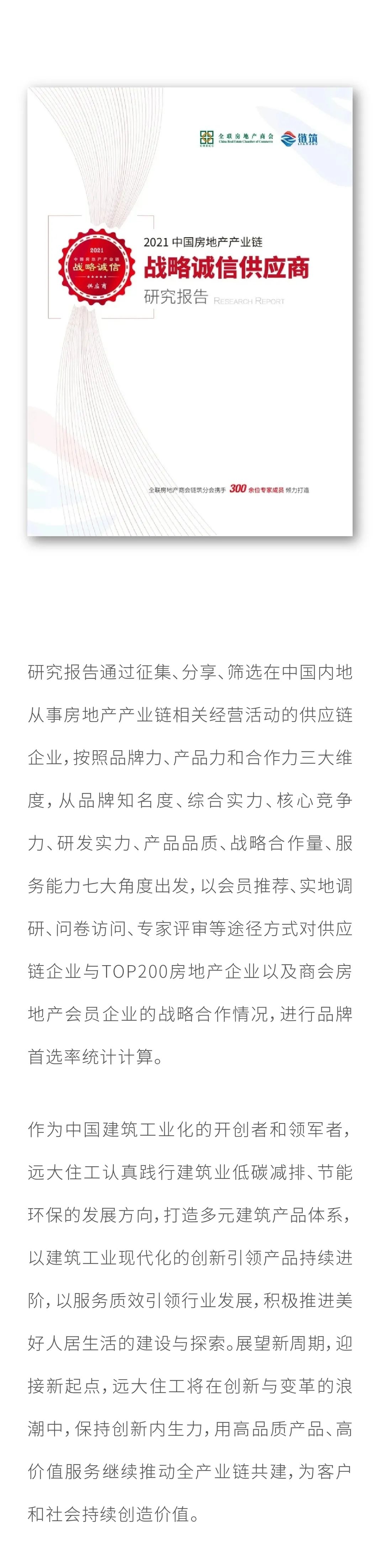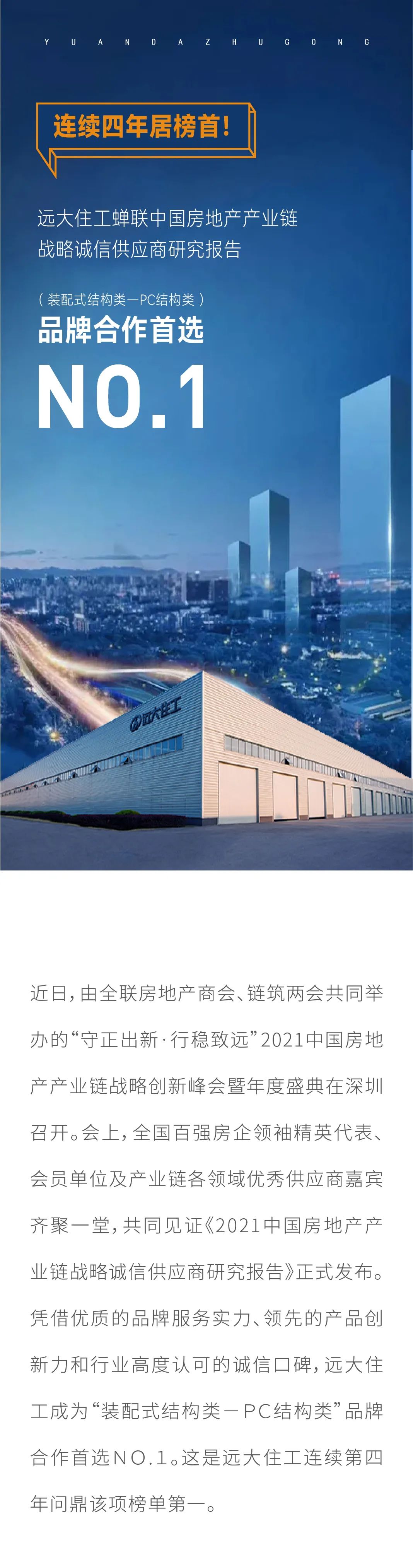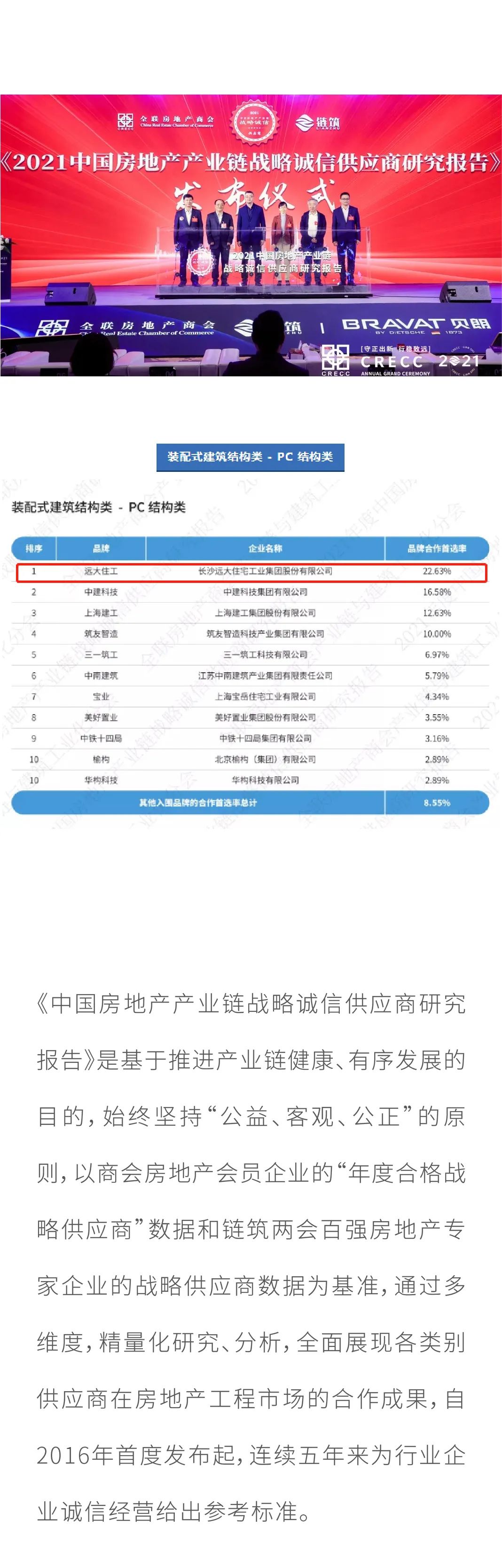 連續四年居榜首! 遠大住工蟬聯中國房地產產業鏈戰略誠信供應商研究報告 (裝配式結構類-PC結構類)品牌合作首選NO.1