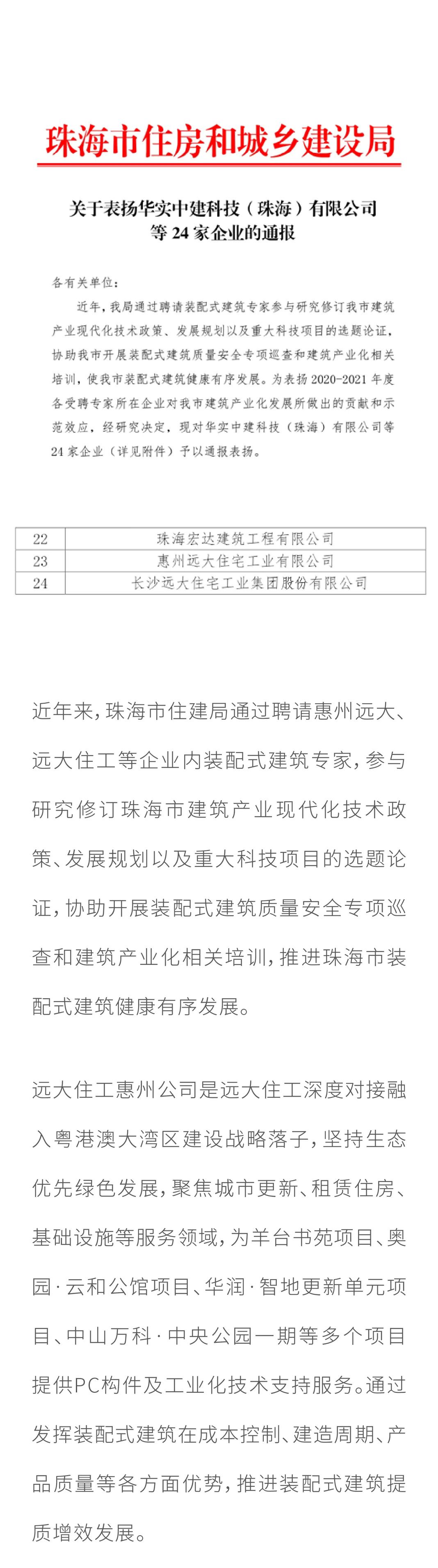 點贊!惠州遠大、遠大住工獲珠海市住建局通報表揚